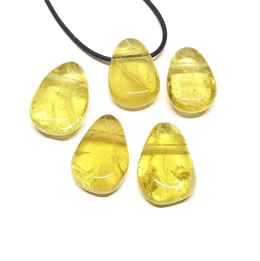 5er Set Lemmon Quarz ( behandelt ) Trommelstein Anhänger gebohrt Sie erhalten fünf Anhänger gleichwertig wie abgebildet Lieferung erfolgt ohne Lederband