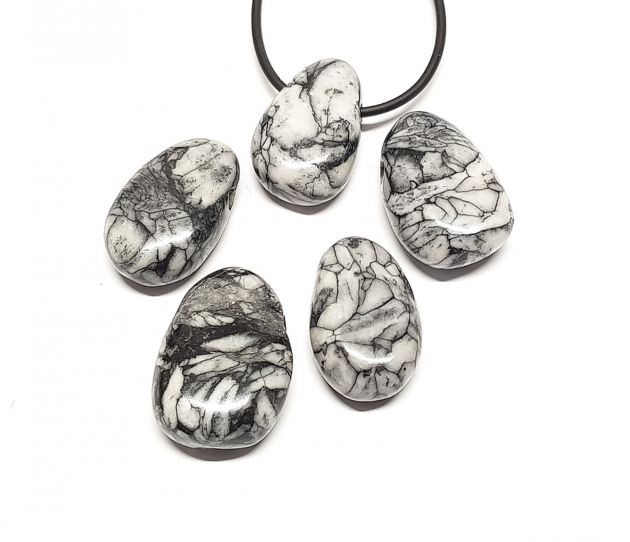 5er Set Pinolith (Eisblumenmagnesit) Trommelstein Anhänger gebohrt Sie erhalten fünf Anhänger gleichwertig wie abgebildet Lieferung erfolgt ohne Lederband