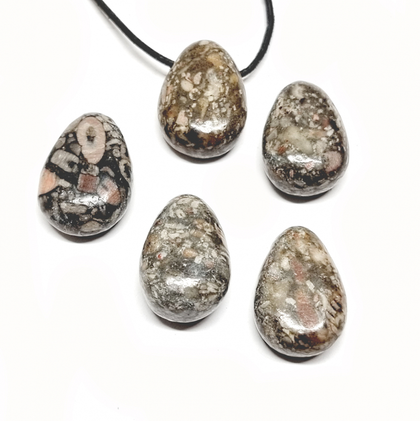 5er Set dunkle versteinerte Koralle Trommelstein Anhänger gebohrt