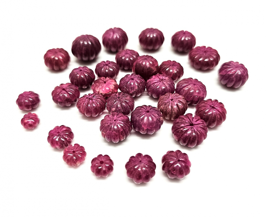 2 Rubin Perlen Melone graviert (behandelt) gebohrt ca. 18-22 mm / ca. 1 mm Bohrung