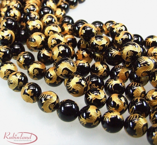 Onyx Kugelstrang Drachen mit Blattgold ca. 14 mm / 40 cm