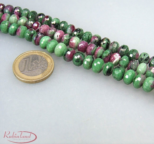 Rubin-Zoisit Buttonstrang facettiert 8 mm / 40 cmDas 1.- Euro Stück ist nicht Bestandteil des ArtikelsSteingröße: ca. 8 mmLänge: ca. 40 cm